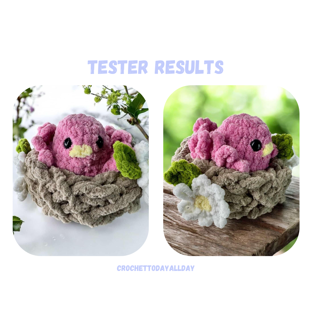 The pattern includes all the parts shown: bird mama, bird baby, nest, egg, flower and leaf.