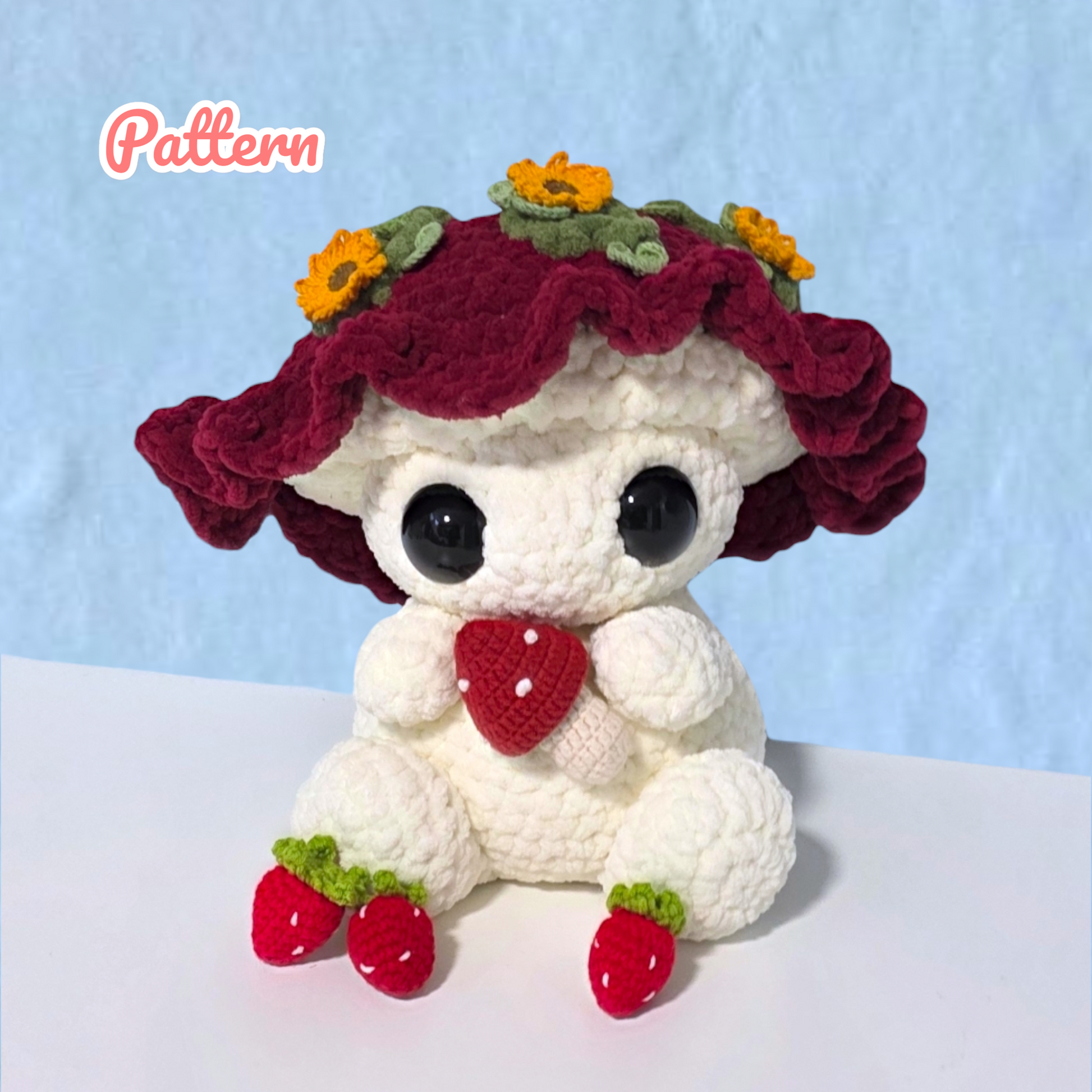 The pattern includes not only the large chibi mushroom but also various accessories for the cap (flower, leaves, moss, dots) as well as the pattern for the strawberry and small mushroom.