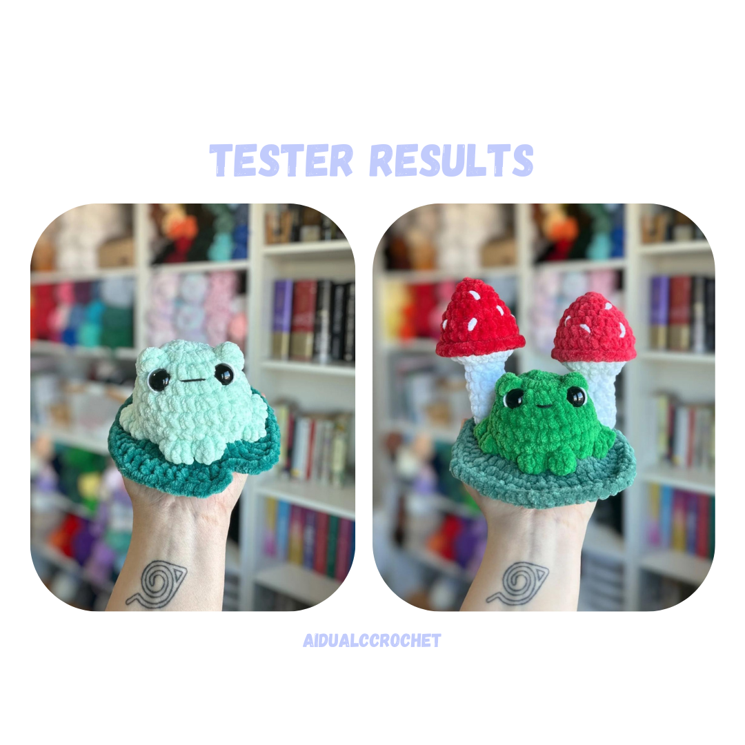 The frogs are all no-sew – the meadow and water lily are crocheted directly onto the frog. Only the flowers/mushrooms need to be sewn/glued on.